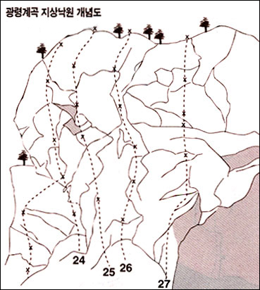 ‘환상의 문’ 우측의 ‘겨울집시’는 90년 겨울동안 암장에 매달려 개척에 열을 올렸던 두 사람이 자신들의 모습을 비유해 루트명을 정했다. 세 루트 모두 140도의 오버행으로 등반길이는 15미터다. 광령계곡 ‘야외음악당’ 맞은편에 위치한 ‘지상낙원’에는 9개의 루트가 남아 있으며 이중 가장 난이도가 낮은 ‘반달크랙(5.8)’은 광령계곡이 자유등반의 메카가 되기 이전부터 등반이 이루어지던 곳이다.