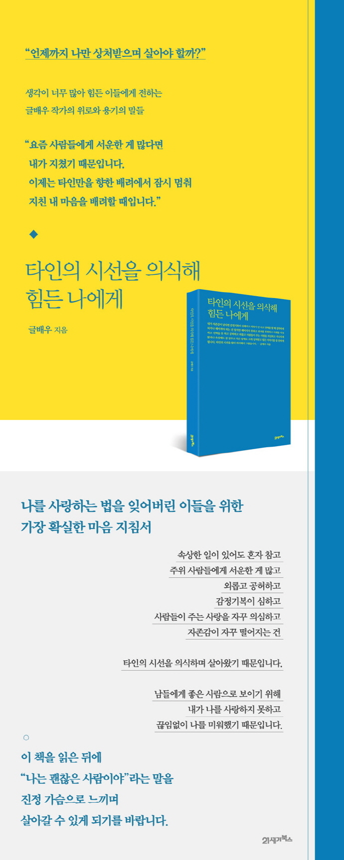남에게 사랑받기 위해 내가 힘들어도 그들에게 잘보이기 위해 내가 나를 사랑하지 않고 끊임없이 미워하며 살아왔던 일 (4쪽)