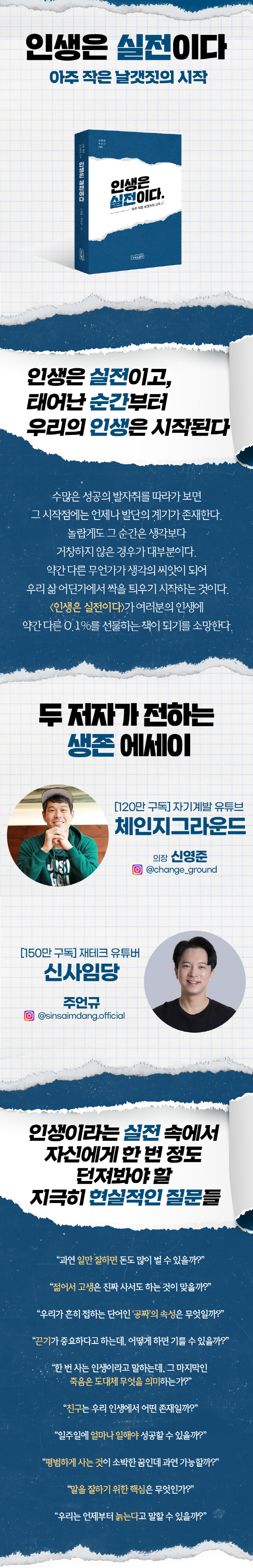 두 저자 모두 아이의 아빠임을 소개하고 있다. 이렇게 간략하게 쓴 저자 소개를 본 적이 없다. 한 사람은 신사임당이라는 이름으로 활약하는 유튜버이고, 다른 한 사람은 체인지그라운드 의장이다. 이것으로도 살 만큼 돈을 버는 사람들이라 할 수 있다. 책을 통해 구독자나 늘리면 된다는 생각 같아 씁쓸하다.