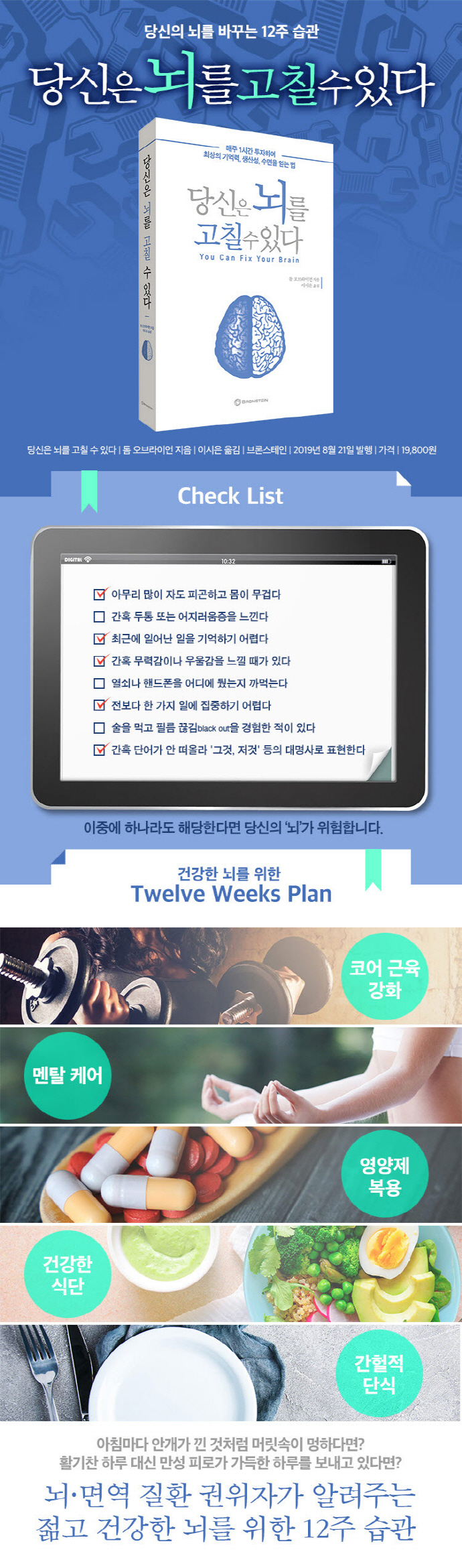 이 책은 제목에서 ‘뇌’를 언급하고 있다. 저자가 알츠하이머나 파킨슨병에 관심이 많아서 그런 것 같다. 책을 읽어본 봐로는 ‘뇌’에 국한하기보다는 ‘건강’ 전반에 관한 책이라고 보는 것이 좋을 듯하다.