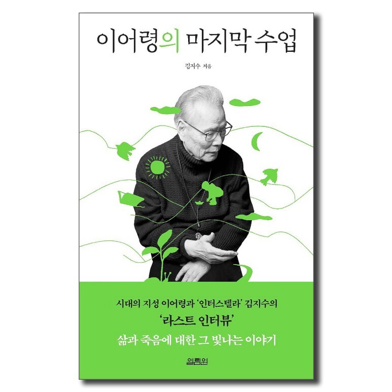 이 책 표지의 특이한 점 하나. 표지를 보면 ‘이어령’과 ‘마지막 수업’은 검정색 글씨이고 중간에 들어가는 조사 ‘의’는 연두색이다. ‘이어령’과 ‘마지막 수업’을 짙은 검정색으로 강조하고 싶었던 것일까. ‘의’를 튀게 보이려는 의도였을까.